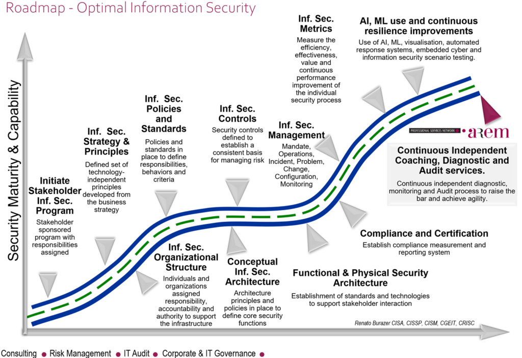 We will be happy to help you diagnose and improve the maturity of your Enterprise Risk and Information Security efforts or work with you on continuously raising the bar on the never ending journey to resilient, sustainable and agile organisation.